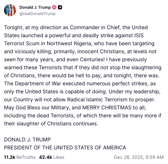 One of the few locatable remarks from the White House about the air strikes came in the form of a Truth Social post from President Trump on Boxing Day.
