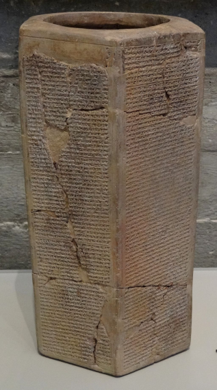 21. The Prism of Sennacherib (c. 690 BC) is a six-sided clay prism inscribed with the annals of King Sennacherib of Assyria, detailing his military campaigns — including his invasion of Judah during the reign of King Hezekiah (2 Kings 18-19; 2 Chr. 32; Isa. 36-37).