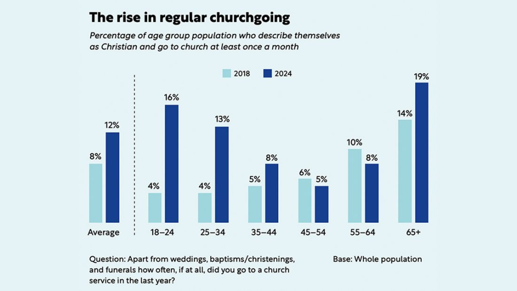 The research, conducted by Bible Society and YouGov, highlights the most significant growth among 18–24-year-olds. In 2018, only 4% of this age group reported attending church at least monthly. That figure has since quadrupled to 16%. Among young men, attendance jumped from 4% to 21%, while young women saw an increase from 3% to 12%.